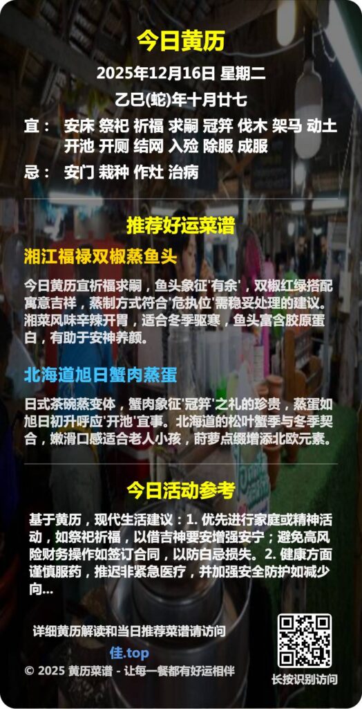 基于黄历,现代生活建议:1. 优先进行家庭或精神活动,如祭祀祈福,以借吉神要安增强安宁;避免高风险财务操作如签订合同,以防白忌损失。2. 健康方面谨慎服药,推迟非紧急医疗,并加强安全防护如减少向西出行;适合启动建设类项目如装修,但需周密计划。3. 利用五行火能量推进工作,但控制冲动,通过冥想或…🌟 更多详细黄历解读和当日推荐菜谱